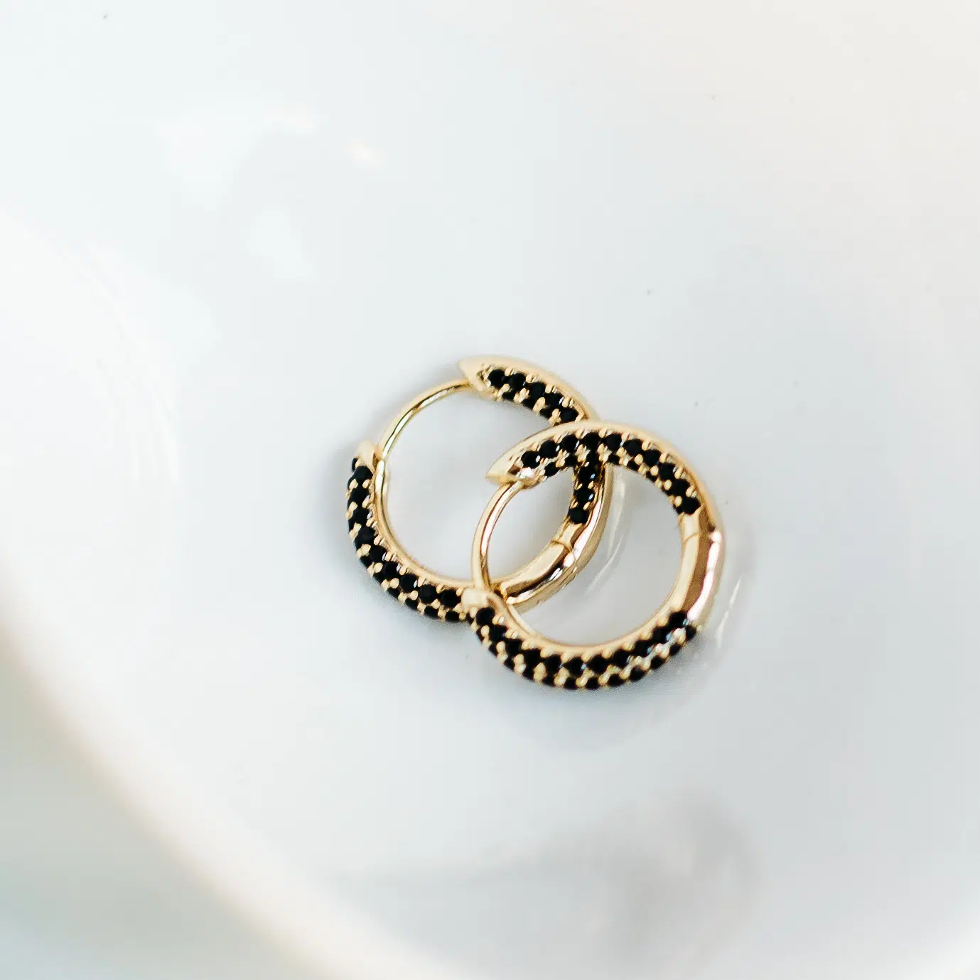 Pair of pave-encrusted tube hoops with Black diamante set in sterling silver rose gold plated. Modern and Edgy take on classic huggies.