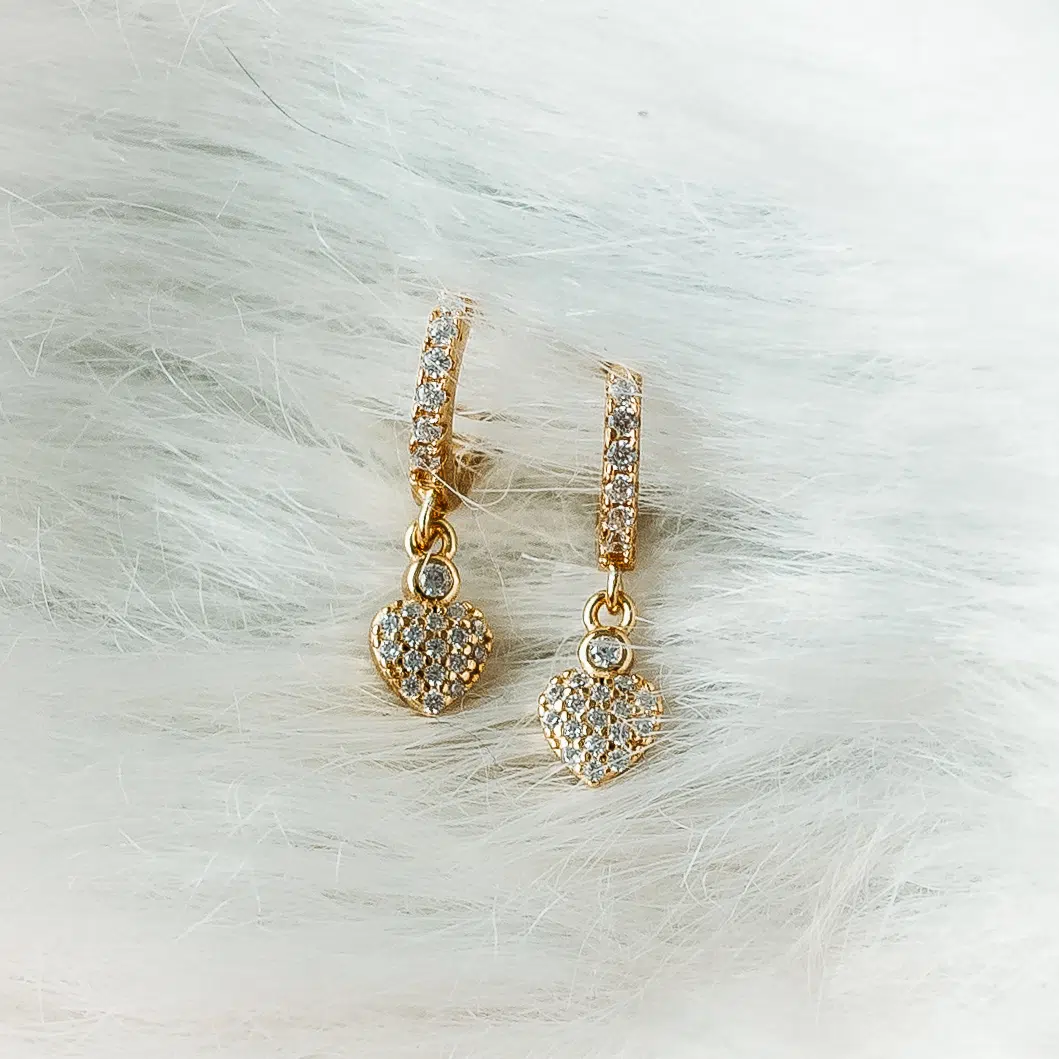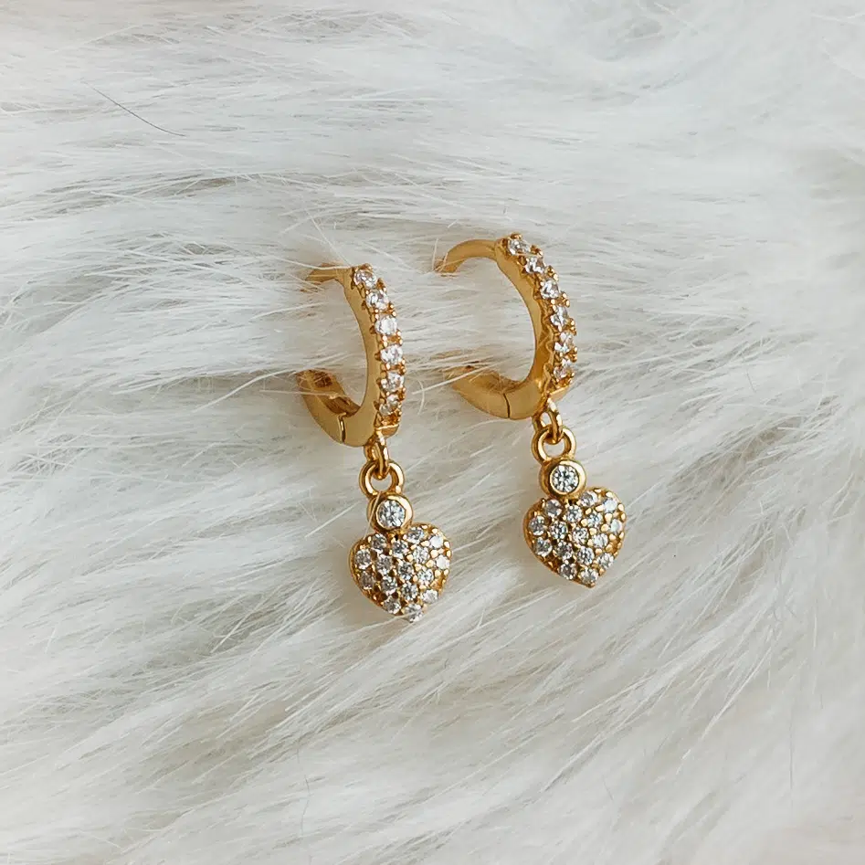 Feel a little playful? Wear your mood on your lobes with these petite huggies featuring the cutest dangly heart charm with diamante. Not only do they look good on their own , they also work fabulously for layering. Perfect ear stack!